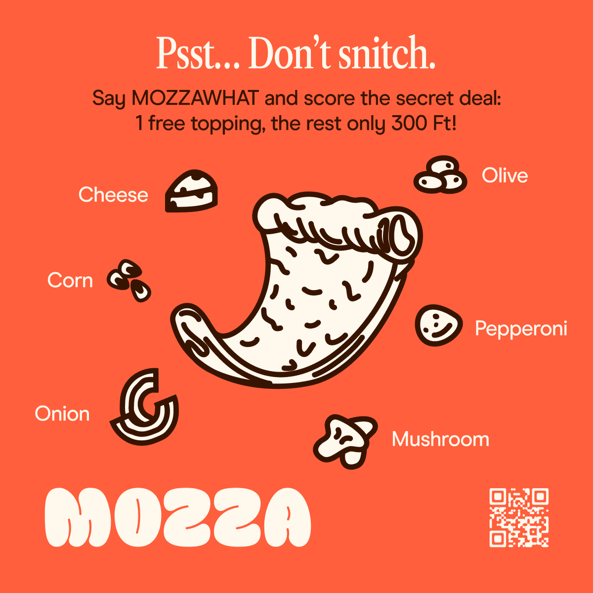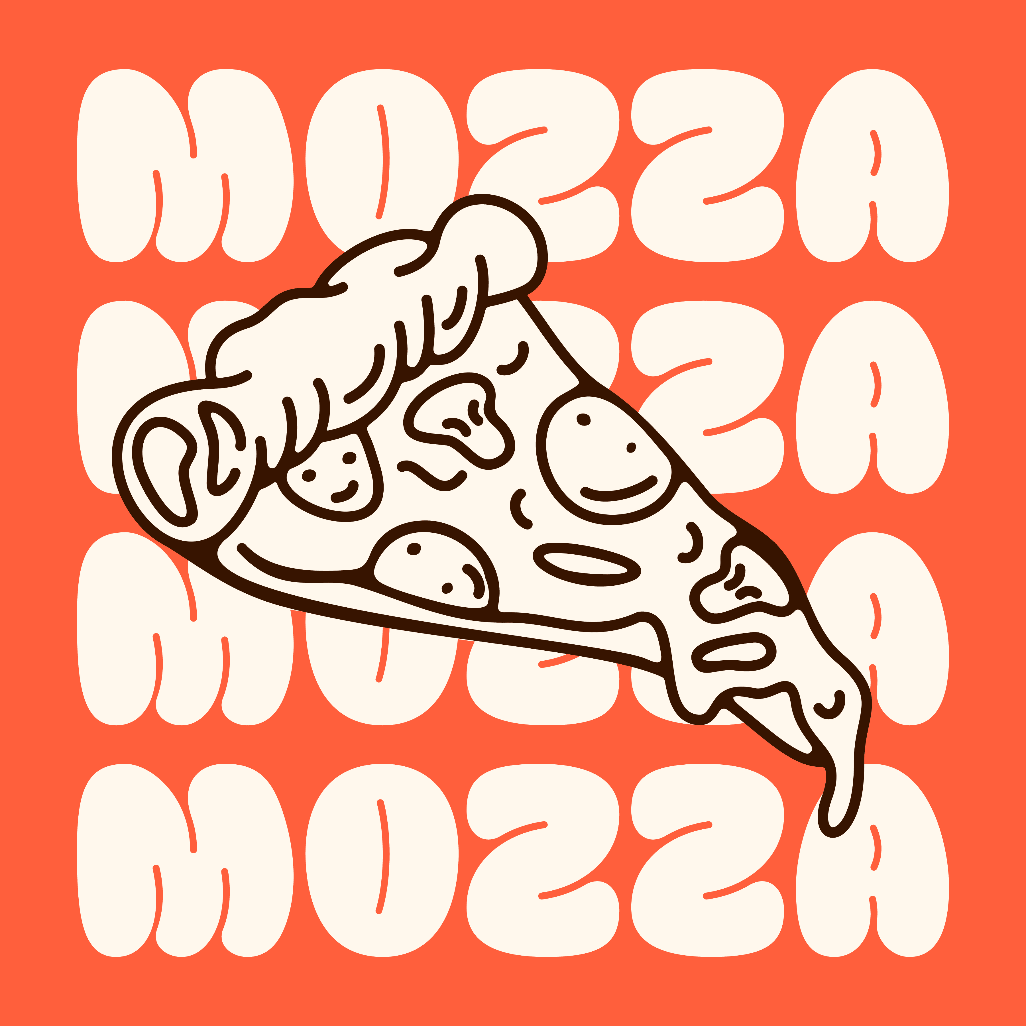 I designed a visual system anchored in a powerful, rounded typeface for the MOZZA logo, and outstanding pizza illustrations to go on top of the logo. It feels bold, touchable, and "puffy" like mozzarella itself. The unique orange-teal color palette replaces standard pizza box colors, making the packaging unforgettable.