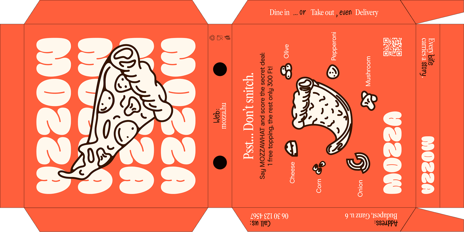 Created for a university packaging design class, Mozza is a conceptual pizza brand built from scratch. The assignment was to create a custom pizza box design.